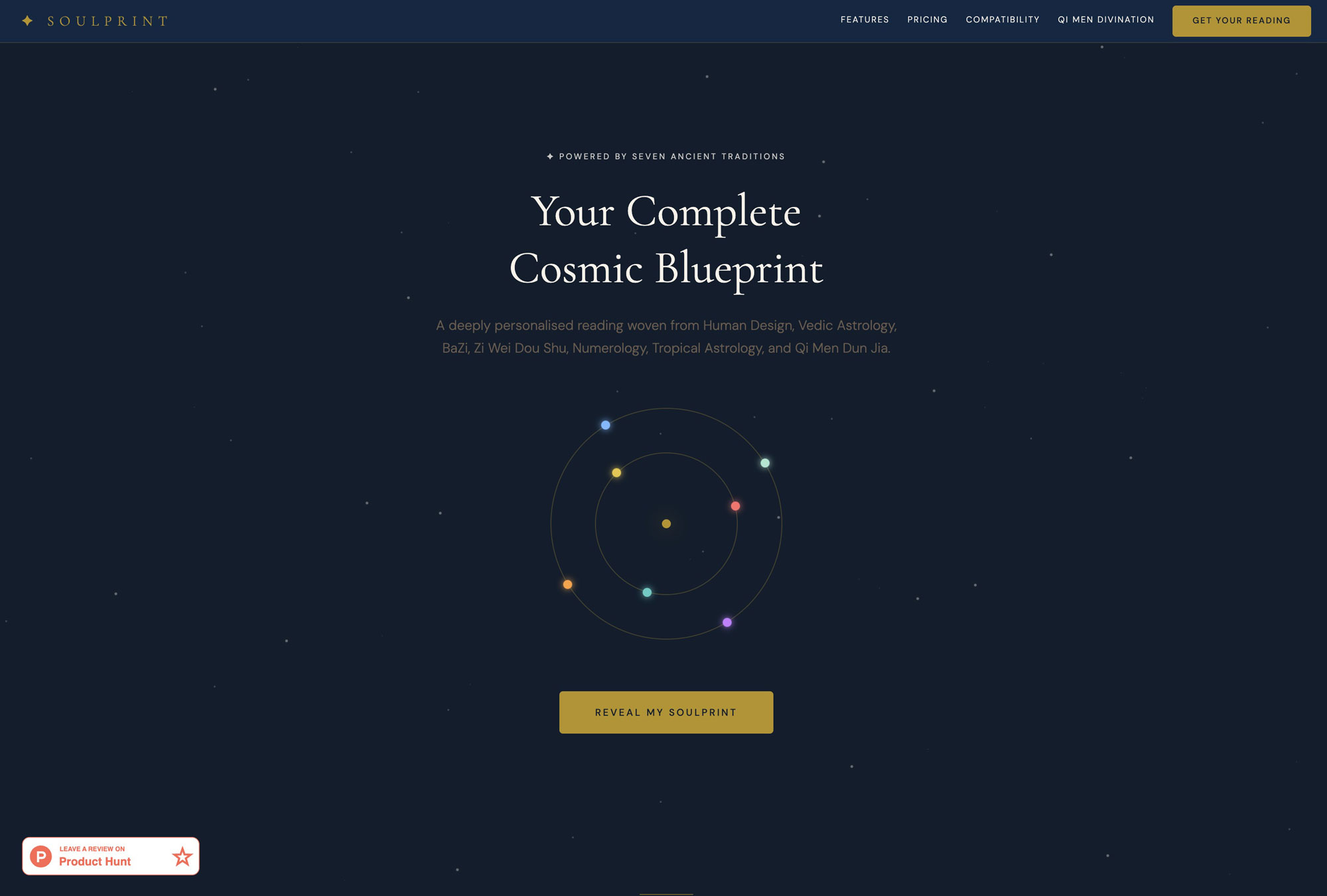 SOULPRINT reads your birth chart through seven systems — Human Design, BaZi, Western Numerology, Vedic, Zi Wei Dou Shu, Tropical, and Qi Men Dun Jia — then uses AI to weave them into a single narrative that makes sense.