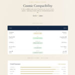 A companion compatibility product analyses two birth charts in synastry, running cross-system analysis on planetary aspects, elemental dynamics, Human Design interaction, and Vedic Ashtakoota scoring. Results are presented with qualitative word labels (no numeric scores) to keep the tone grounded rather than gamified.